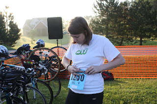 All set up and ready to go. I always use my pink striped towel for races because it's the only way I can spot my bike as I come running into transition.